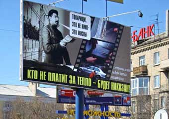 Агитационные щиты с изображением советского лидера Иосифа Сталина и угрожающей надписью «Товарищи, это не кино – это жизнь! Кто не платит за тепло – будет наказан» появились на улицах Донецка. Щиты установлены по инициативе местного предприятия «Донецкгортеплосеть», обеспокоенного низкими платежами населения за потребленную энергию.