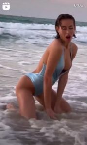 Валентина, которую называют «копией Ирины Шейк» за несомненное сходство с королевой подиумов, сексуально изогнулась в пене прибоя, демонстрируя пышную грудь норовящую сбежать из тесного купальника.