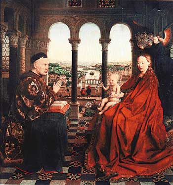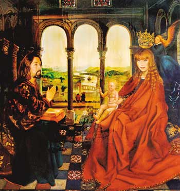 “Мадонна с младенцем”, по словам Сафронова, — современный ремейк полотна голландского живописца XV века Яна ван Эйка “Мадонна с канцлером Ролленом”. Только канцлера Никас заменил на Луку. А вообще, по задумке художника, эта картина должна войти в серию “Река времен”, в которой известные люди изображены в старинных одеждах, сообщает Комсомольская Правда.